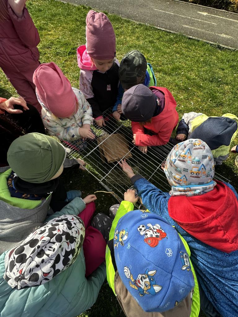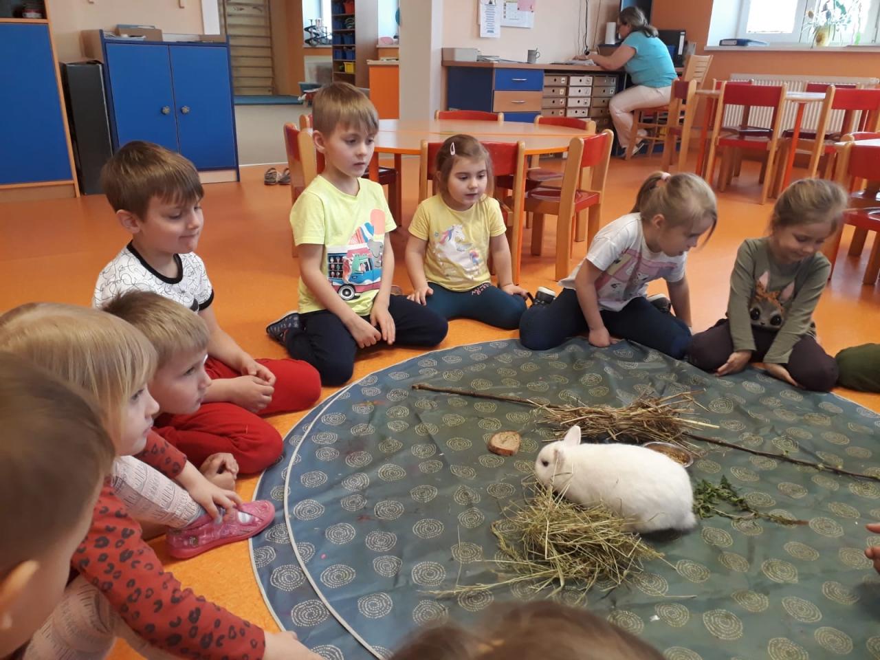 V dubnu jsme si povídali o zvířátkách- mláďátkách. Mnoho z nich děti viděly na demonstračních obrazcích či videích, ale jelikož máme v pedagogickém sboru chovatelku menších domácích zvířat, paní učitelku Zdeničku, tak jsme si mohli povídat, pozorovat i hladit králíčka a morčátka.