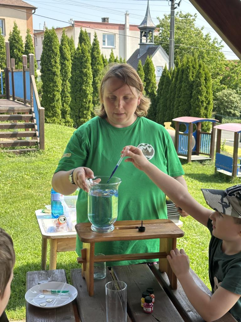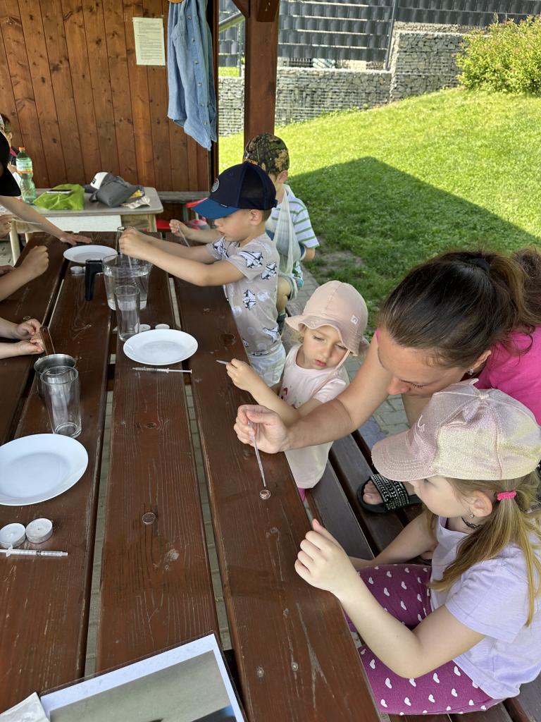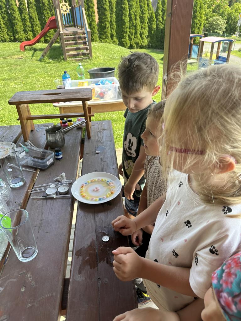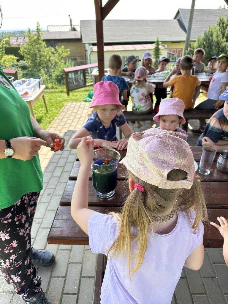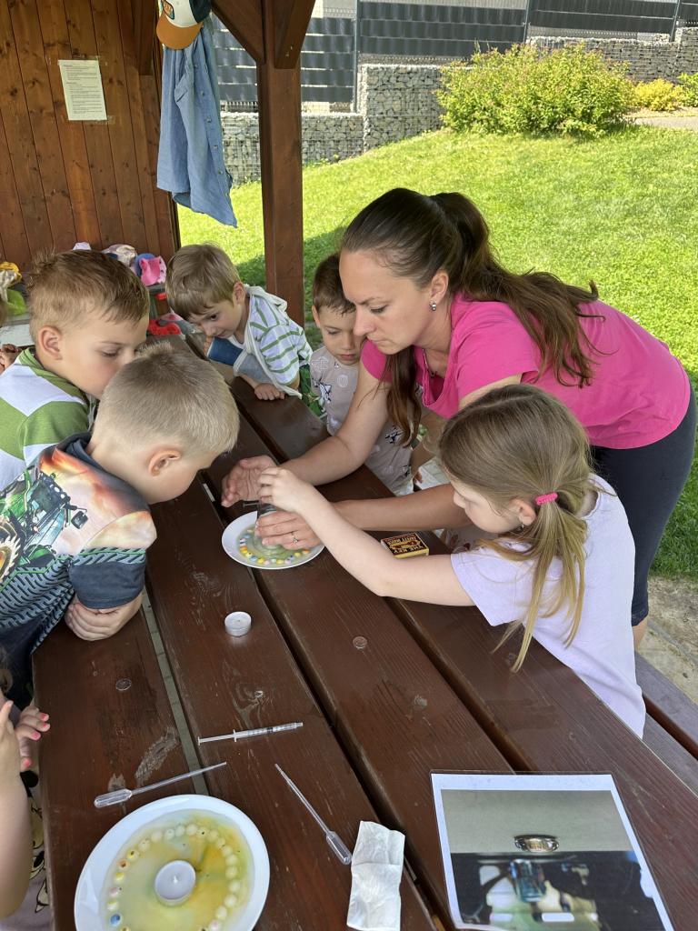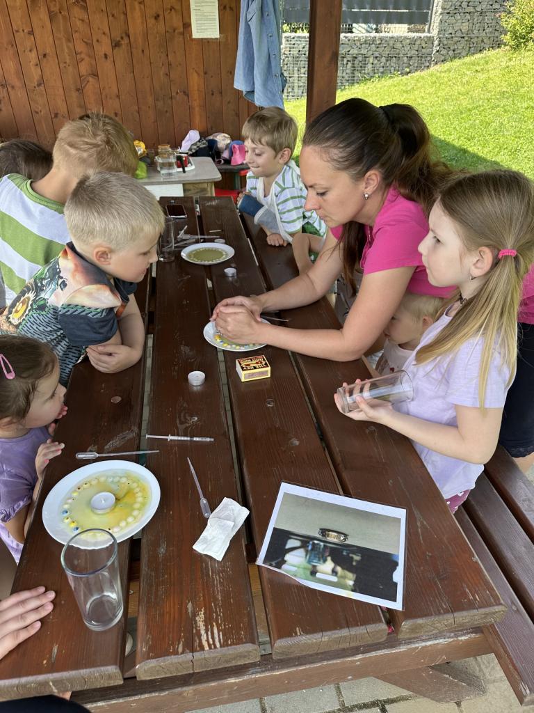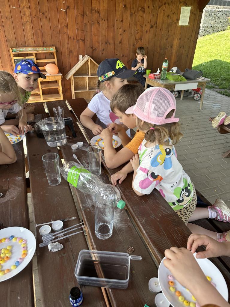 Děti měly mnoho aktivit, pozorovaly různá skupenství vody, dělaly pokusy s vodou- zapouštění barev do vody - pozorování jak se barva míchá, míchání barev, duha na talířku, co se stane když...?, propichování sáčku s vodou, kapaní pipetou na minci- vodní bublina a jiné zajímavosti.