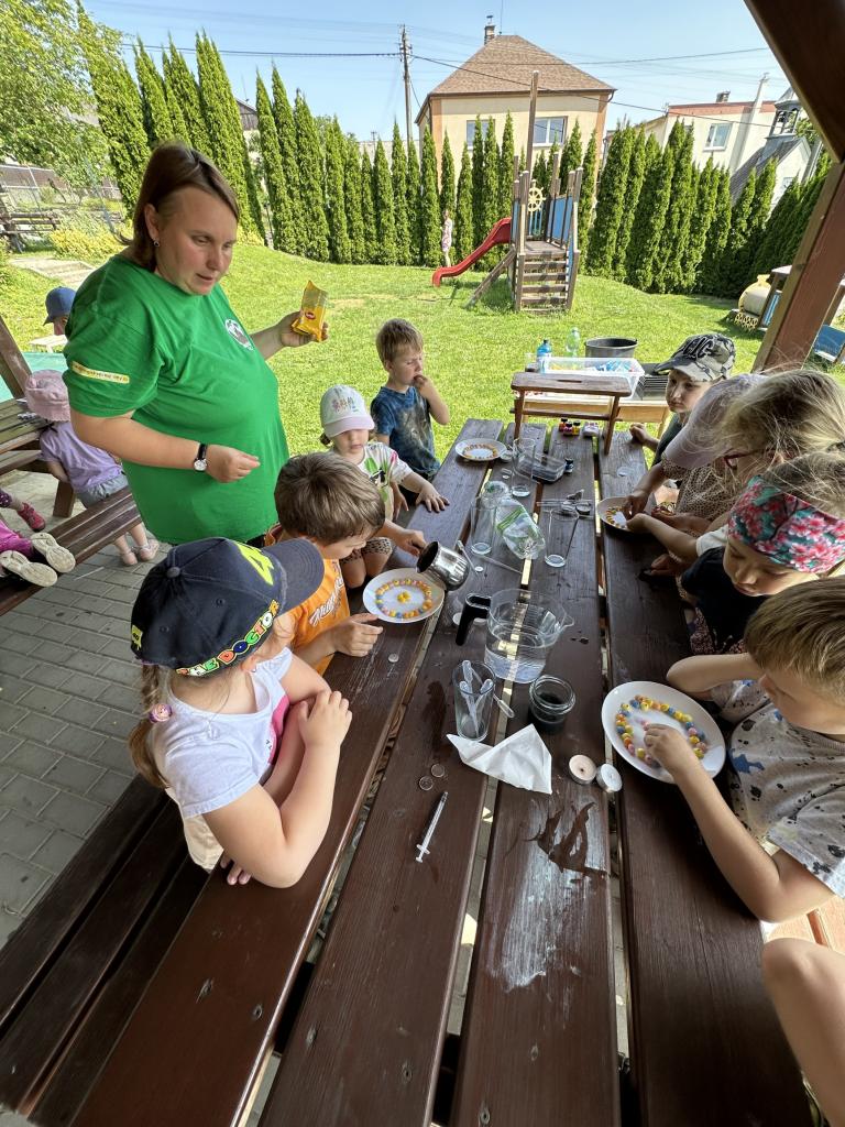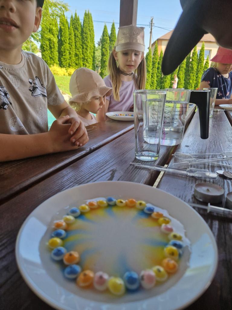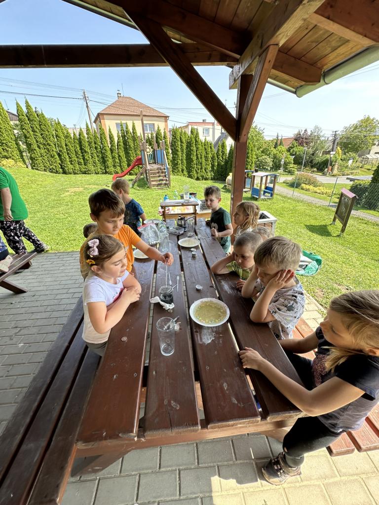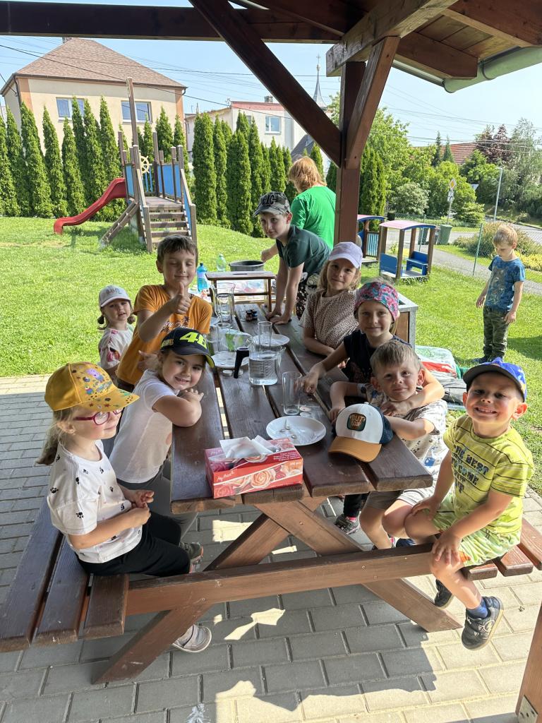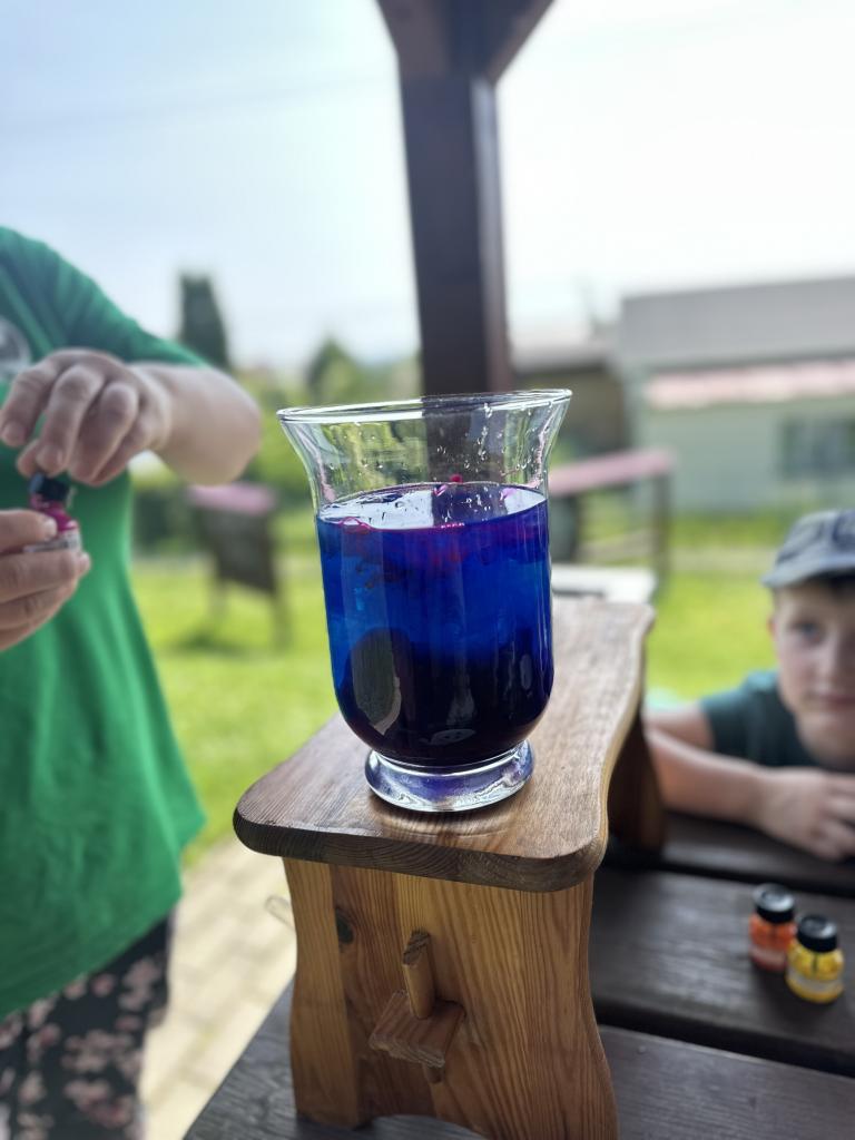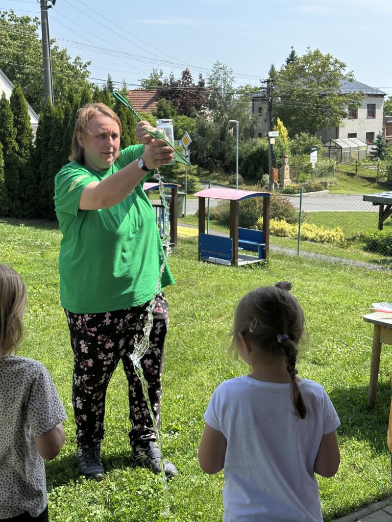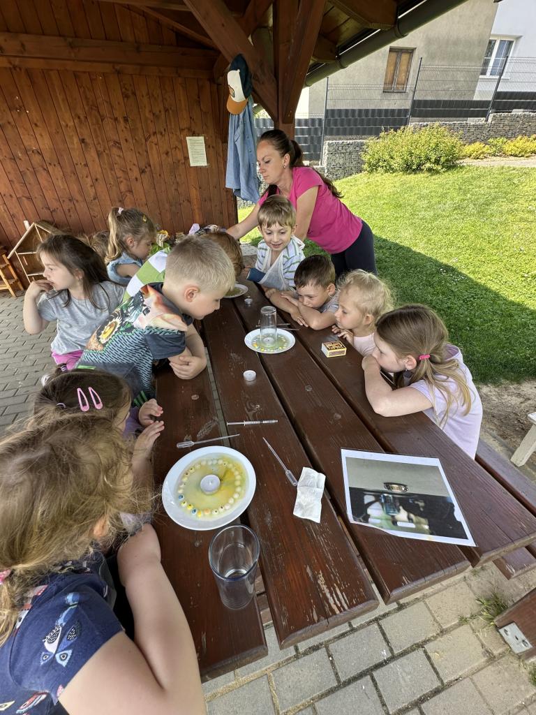 Děti měly mnoho aktivit, pozorovaly různá skupenství vody, dělaly pokusy s vodou- zapouštění barev do vody - pozorování jak se barva míchá, míchání barev, duha na talířku, co se stane když...?, propichování sáčku s vodou, kapaní pipetou na minci- vodní bublina a jiné zajímavosti.