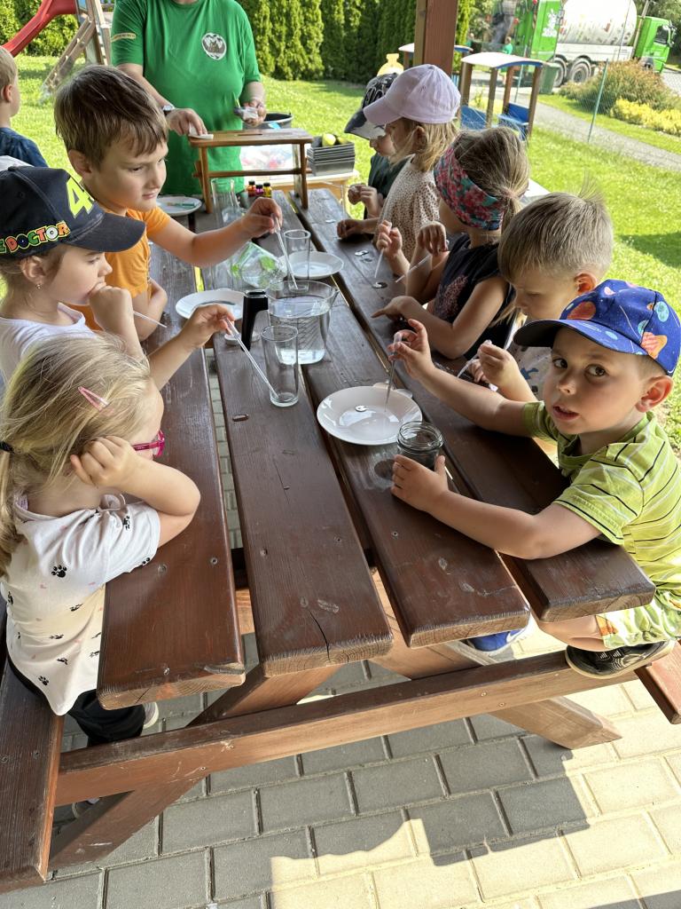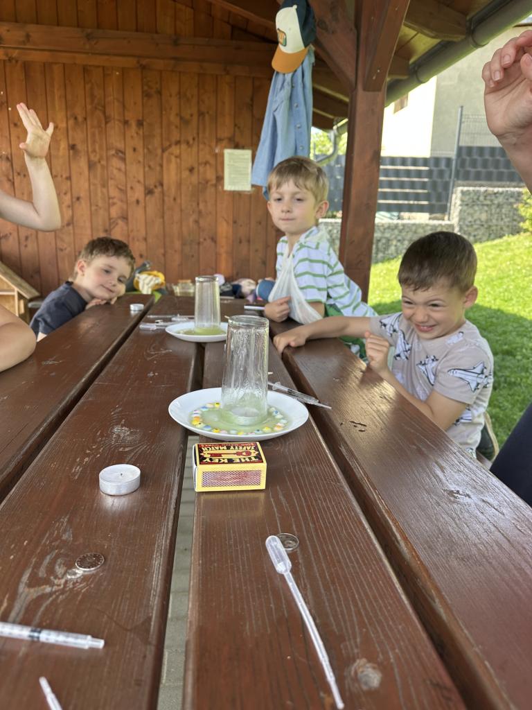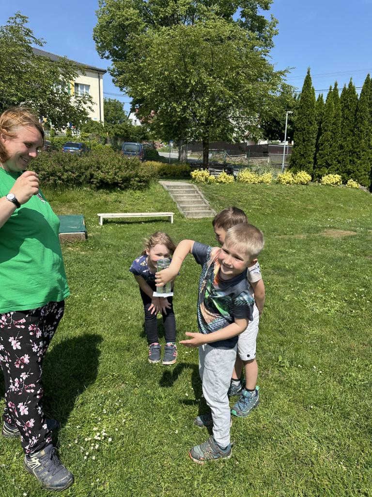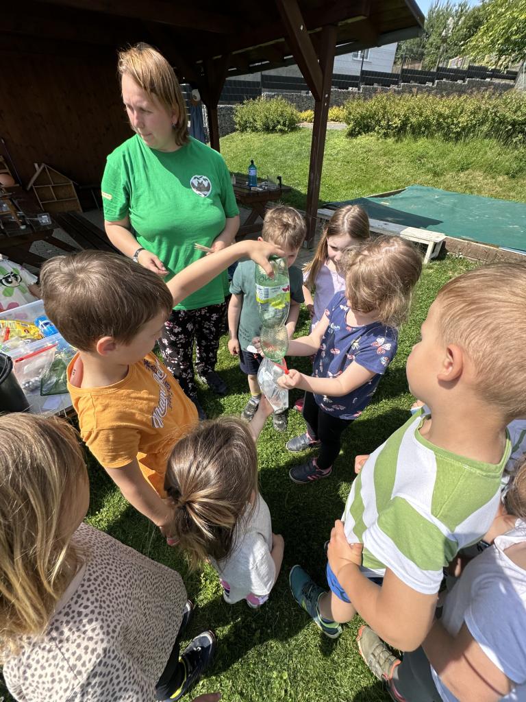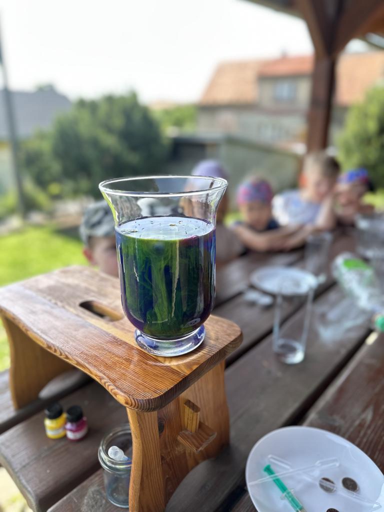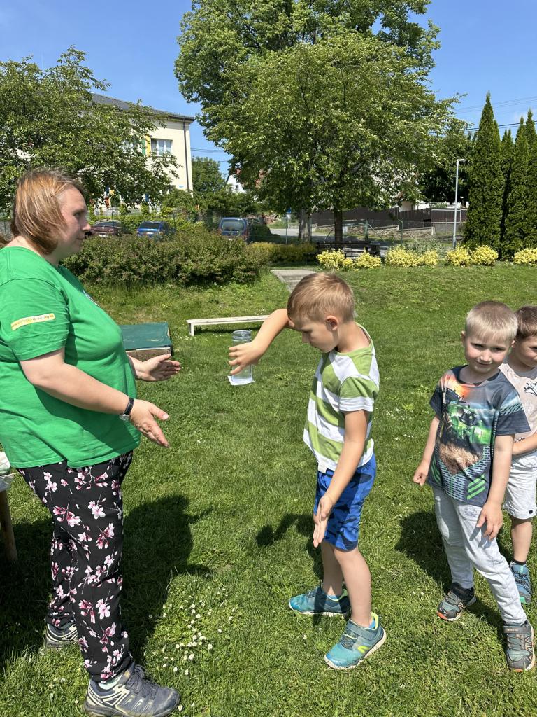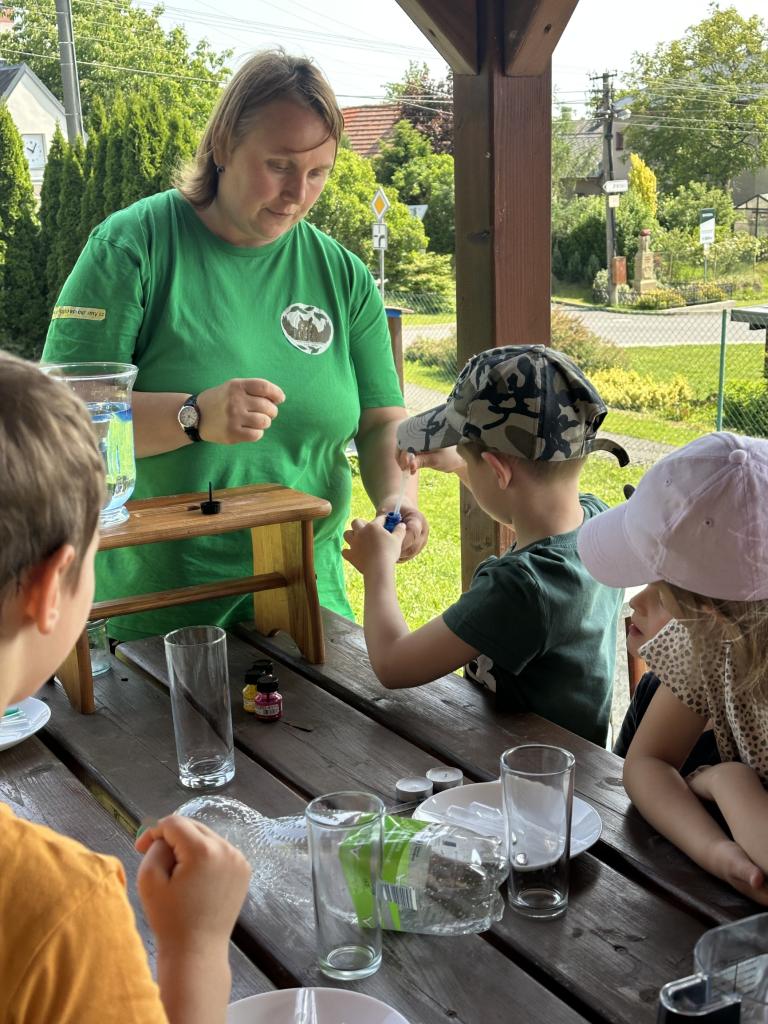 Děti měly mnoho aktivit, pozorovaly různá skupenství vody, dělaly pokusy s vodou- zapouštění barev do vody - pozorování jak se barva míchá, míchání barev, duha na talířku, co se stane když...?, propichování sáčku s vodou, kapaní pipetou na minci- vodní bublina a jiné zajímavosti.